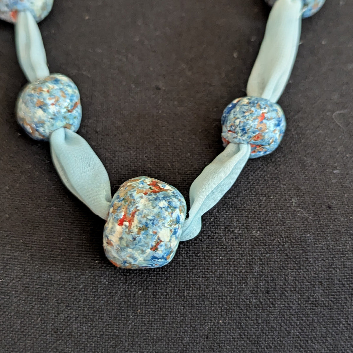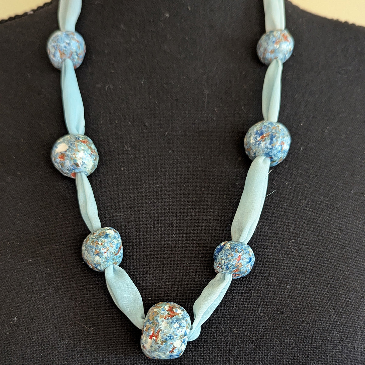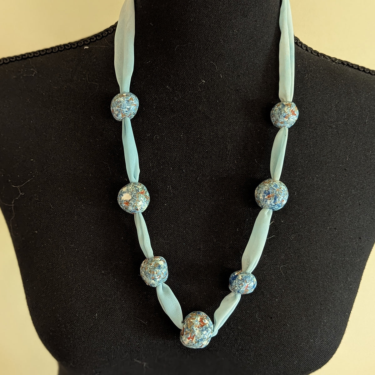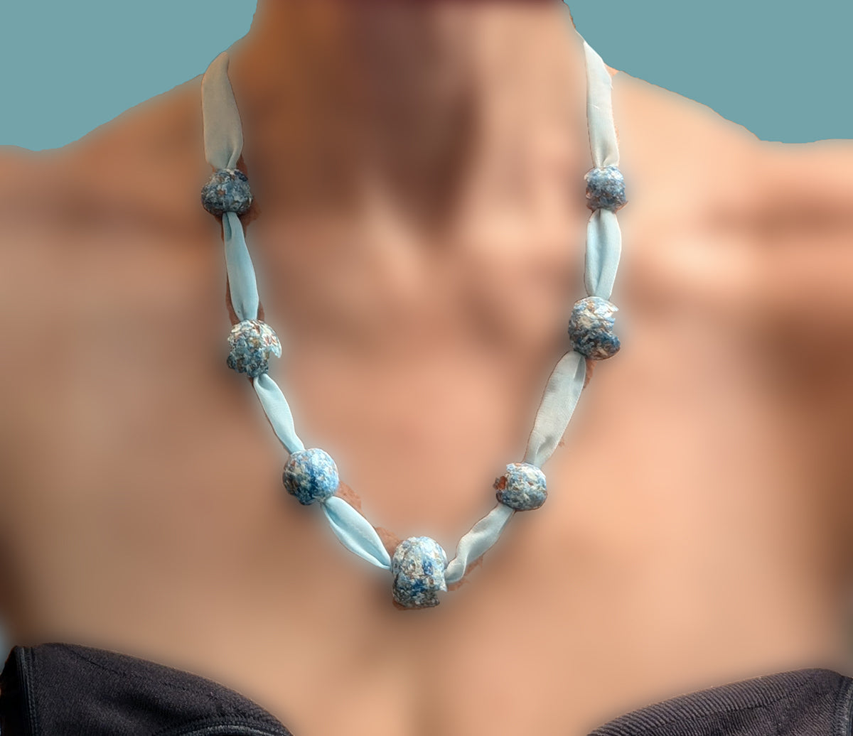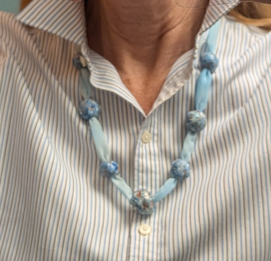 To create the Anna necklace, Jetsy used her own hand-dyed chiffon fabric and added the handmade and hand painted beads. The beads are various shades of blue with white, and some of the natural terracotta shows through. Handshaped, they are each unique, and contrast in a lovely way with the filmy chiffon.