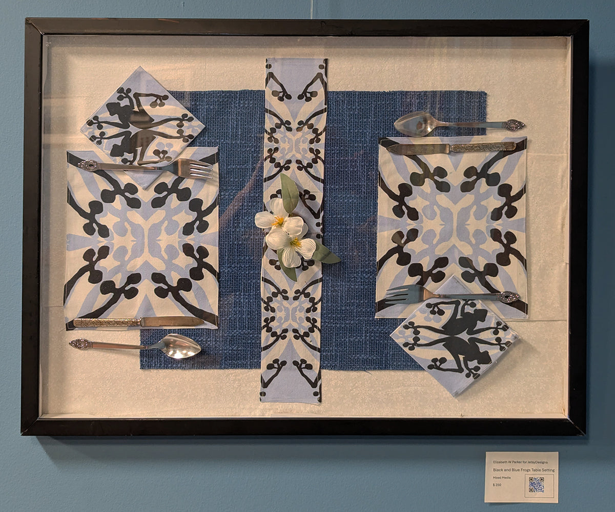 This diorama tablescape has two place settings of our "Blue Frogs" design at 1/2 scale from the original placemats and napkins. The tablescape includes a runner and a flower centerpiece. Mixed Media. Framed diorama measures 20" W x 16" H x 1.5" D. Ready to hang.