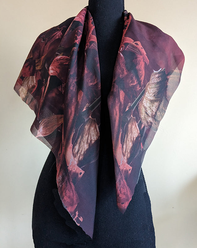 This design was create from a montage of photographs and is printed on chiffon (100% polyester), a sheer fabric with a lovely drape and feel that makes it the standard for neck scarves.