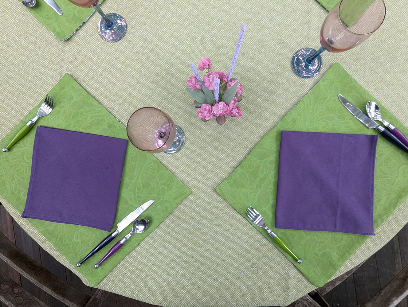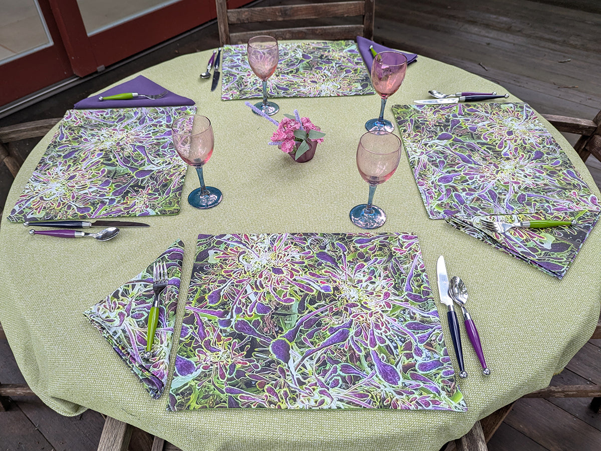 This placemat is made from two Jetsy fabrics, both from a photograph of fancy chrysanthemums. One side is a vibrant confetti of purples and greens, and the coordinating fabric is a version of the same thing, but just in green.