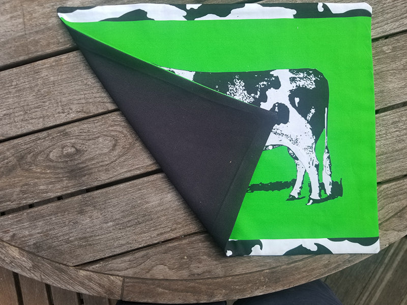 This place mat is made from the same design as the "Cows on Green" pillow. It measures approximately 17" X 14". 100% cotton, front and back. The back is made from black duck cloth.
