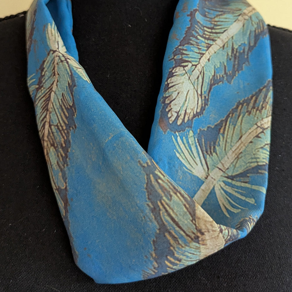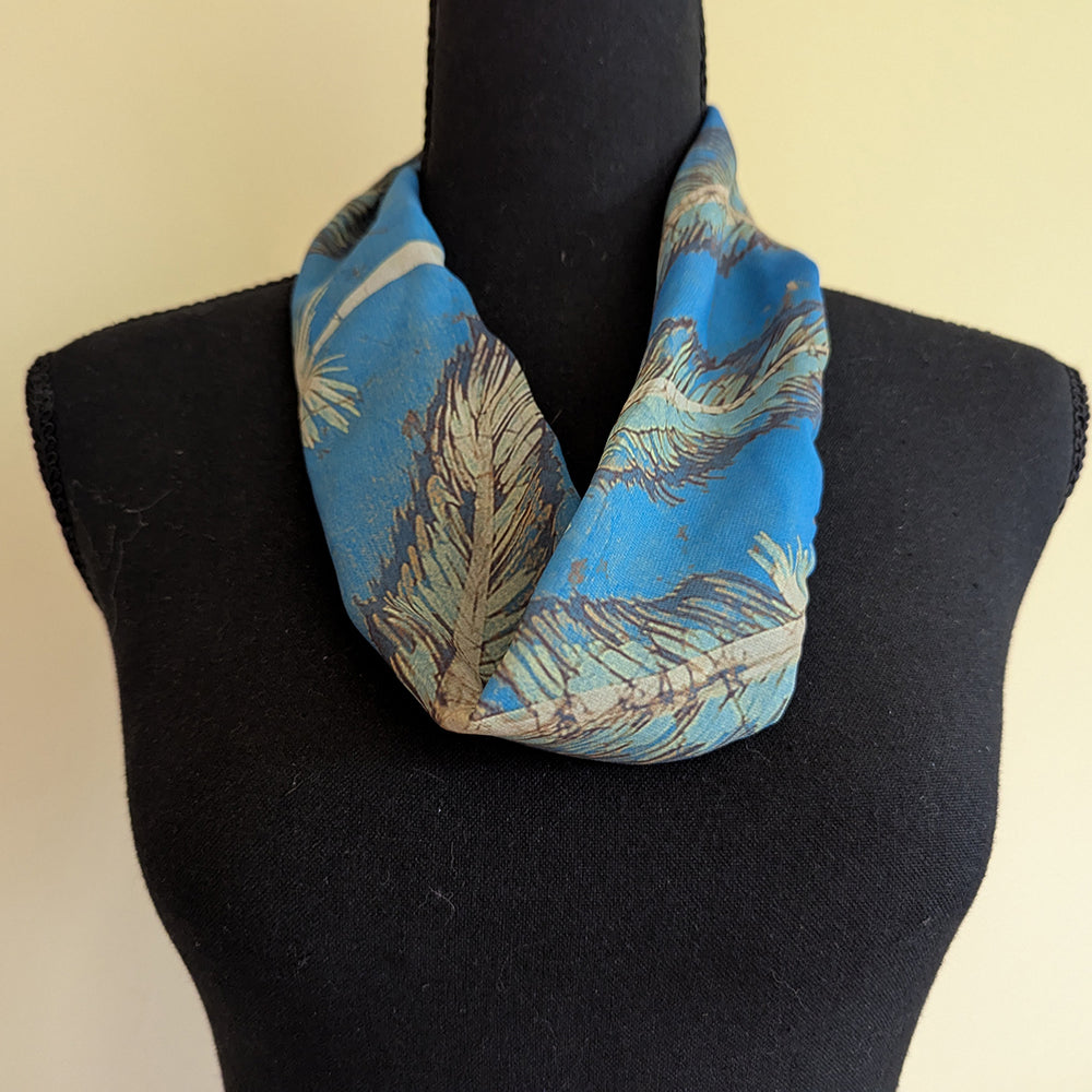 This design is from a batik scarf I made in the 1970s. Feathers appear on blue chiffon (100% polyester), a sheer fabric with a lovely drape and feel that makes it the standard for neck scarves.
