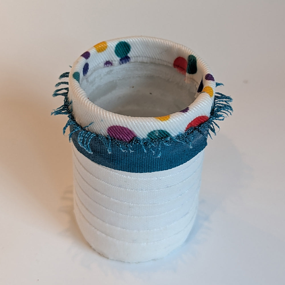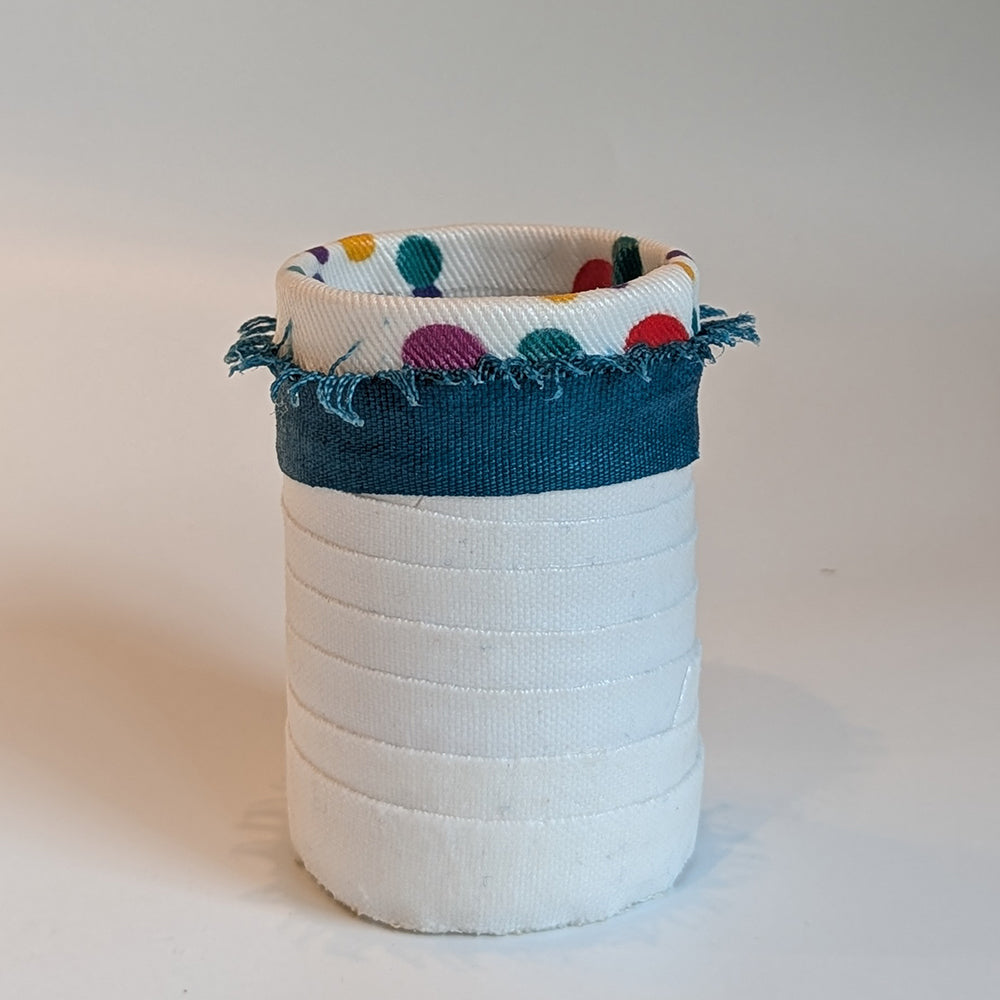 Spiky Dots (4") is clear glass wrapped in white duck, with a band of teal duck with spiky fringe. The fabrics are sealed, but the piece is less suited to water-based flower arrangements. (Fill only half way.) The top is a Jetsy fabric called Dots. Its wide mouth makes it suitable for pencils or pens, or dried flowers.