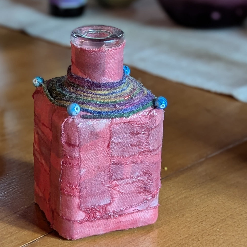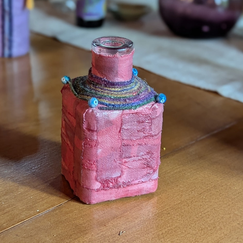 Square basket is also wrapped fabric that is sealed. The fabric pieces resemble a basket weave. The top of the bottle is wrapped in multicolor yarn and the corners are accented by beads, The interior bottle is clear. Piece is about 2" square and 5 1/2" tall.