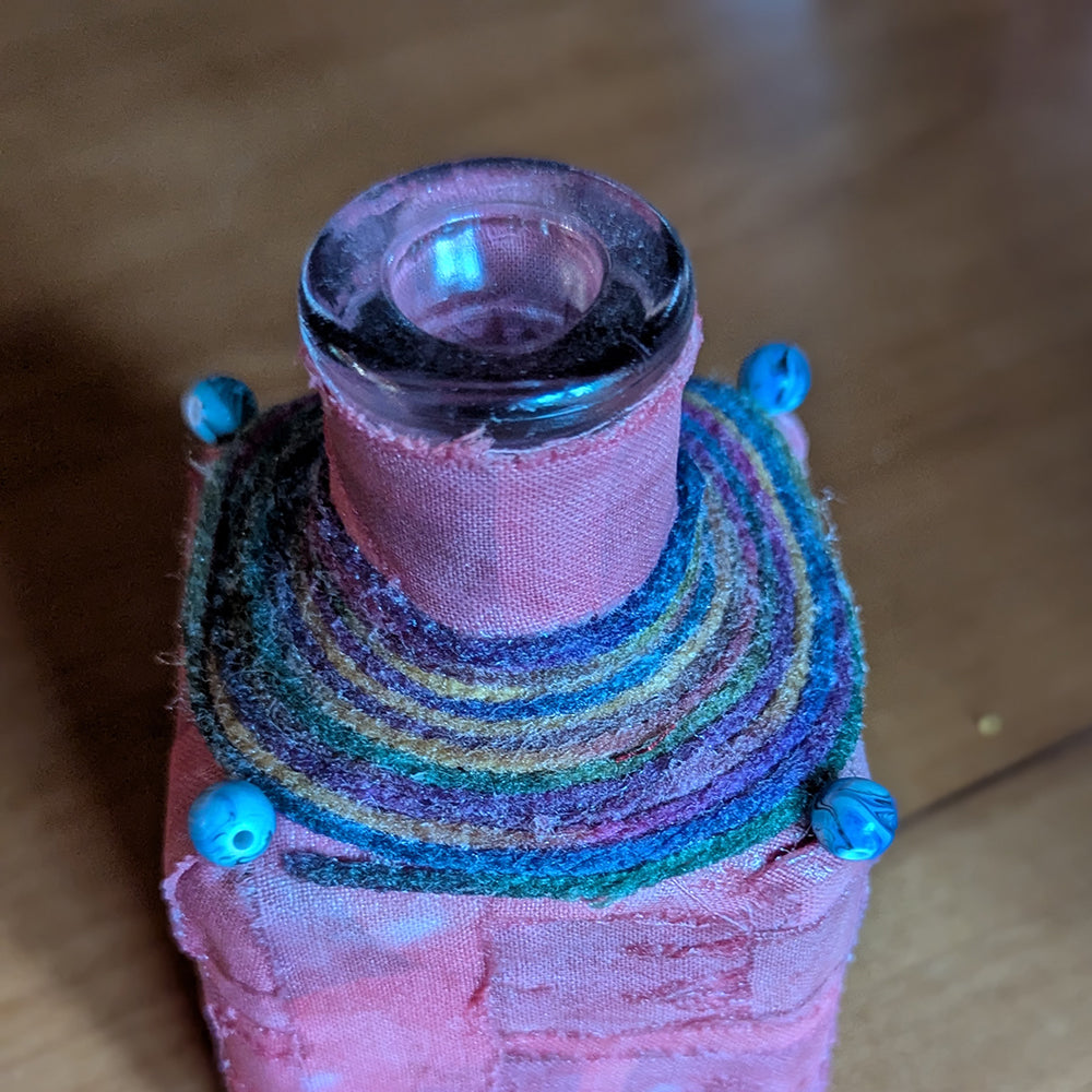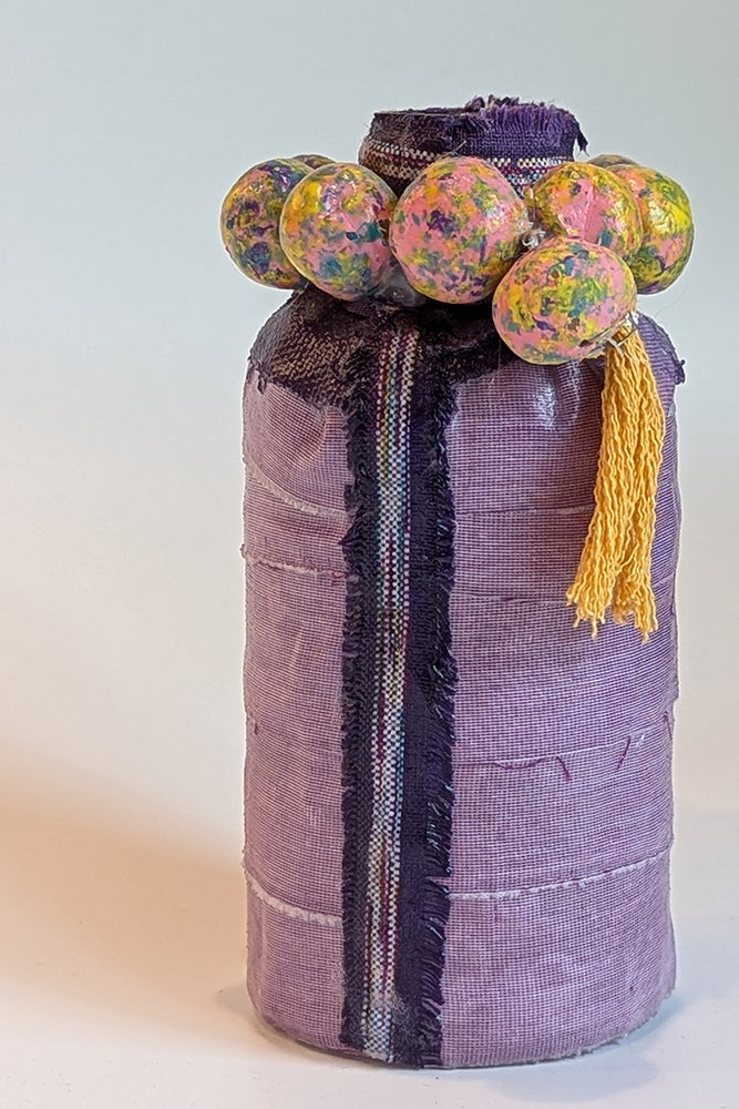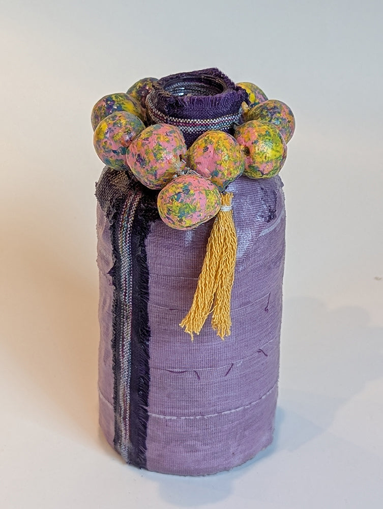 All our vases are one-of-a-kind. They are fashioned from bottles, and other containers, and adorned with fabric, beads, clay and found materials. Prices will vary depending on size, complexity and materials used. Waterproof unless stated otherwise. Hand wash with care.