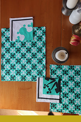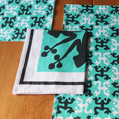 These colorful place mats are designed around a combination of teal and black and white, featuring Taino coqui frog symbols, and hand-drawn frogs. All pieces are sold individually, mix and match to your heart's content!