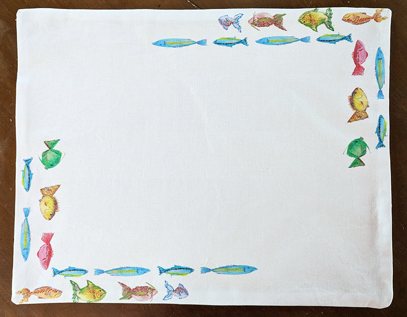 Watercolors of imaginary fishes swim around the edges of these colorful and fun place mats.