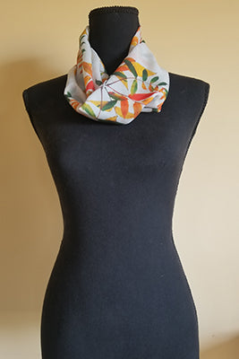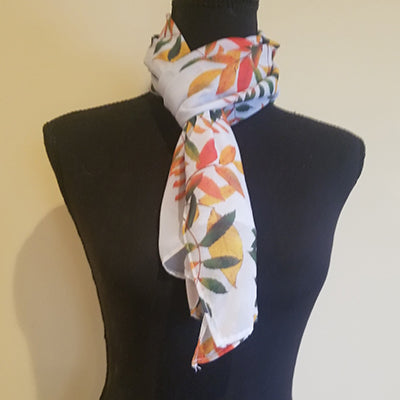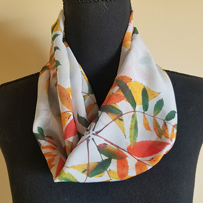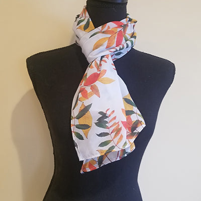 This design of of a collage of fall sumac leaves against white is printed on chiffon (100% polyester) a sheer fabric with a lovely drape and feel that makes it the standard for neck scarves.